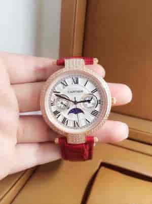 尺寸:36mm 材料:瑞士石英.小牛皮 描述:水壶系列玫瑰金镶钻腕表,Pasha de Cartier 腕表是卡地亚最具历史意义的系列之一,旨在向过去的圆形造型致敬。Pasha与生俱来力量和自信的意涵挑起了权力和难以抗拒的诱惑魅力。玫瑰金表壳,镶钻表圈,蓝宝石玻璃,瑞士石英机芯(多功能型)
