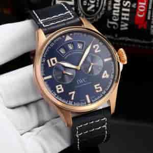 .大型飞行员系列 材质:动能自动机械.牛皮 尺寸:宽46mm 厚14mm 描述:万国IWC 大飞左右眼,全自动机械机芯 精钢表壳 带有动力显示功能 洋葱大把头,5AT防水。