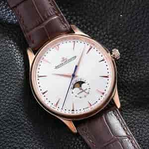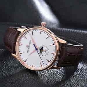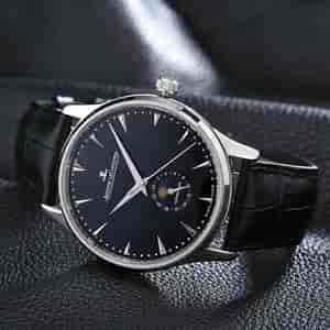 .超薄大师系列 材质:月相自动机械.牛皮 尺寸:宽42mm 描述:JAEGER LECOULTRE Master Ultra Thin Moon积家超薄大师系列腕表,秉持了积家的一贯传统,其每个细节都延续了品牌细腻的品位和考究的风格,腕表的外观以简洁利落为诉求,无论是经典隽永的表盘设计,还是以精钢或玫瑰金雕凿的表壳线条都不例外。搭配原装折叠表扣,令佩戴无比舒适!