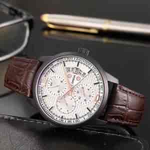 材质:多功能自动机械.牛皮 尺寸:宽44mm 厚14mm 描述:全精钢重量十足,多功能机械,黑,金,白,三种处壳颜色,搭配高亮量水晶玻璃,商务休闲男仕腕表