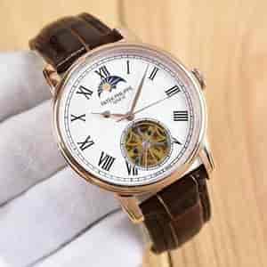 材质:月相自动机械.牛皮 尺寸:宽41mm 厚12mm 描述:百达翡丽-PATEK PHILIPPE王者至尊 火爆新款上市 精致飞轮男士机械腕表 原装进口全自动机械机芯 316精钢CNC表壳 顶级品质 三针星辰搭配镂空飞轮设计 时尚大方 尽显王者风范