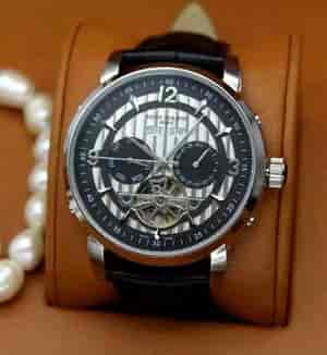 材质:瑞士磷片机械.316精钢 尺寸:宽41mm 厚13mm 描述:百达翡丽爆款精品男士万年历双窗飞轮腕表,搭载镂空雕花全自动机械机芯,进口超强镀膜镜面,316L精钢表壳
