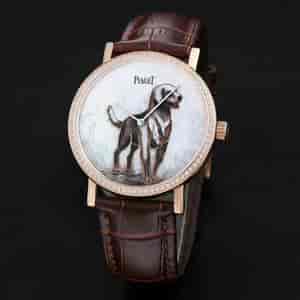 .Altiplano系列 材质:进口9015自动机械.蓝宝石 尺寸:宽40mm 厚7.5mm 描述:旺!旺!旺!2018年,为庆祝中国农历新年,伯爵Altiplano系列掐丝珐琅表推出“忠犬旺新春”,型号:G0A42540,大明火掐丝珐琅镶嵌表盘,饰有忠犬图案,采用超薄进口9015机芯,动力储存45小时,意大利小牛皮,配针式表扣,佩戴方便耐用,限量版发售50只!戴上此表旺年必行大运,让我们的旺财旺起来