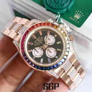 .迪通拿系列.SGP 材质:瑞士ETA7750自动机械.316精钢 尺寸:宽40mm 描述:一比一复刻 日误差0-3秒【SGP工厂】最新第二代迪通拿彩虹款!“晚虹斜日塞天昏,一半山川带雨痕”。纯黑的表盘仿佛是黄昏背景,更突显表盘及外圈上斑斓的彩虹刻度,而表耳及护肩的钻石就像雨滴一般,带有莹润透亮的质感。与第一代相比,今年的新款彩虹迪主要有三个壳变化,分别在表盘刻度、指针颜色和表壳材质!