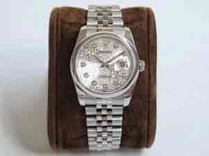 .日志型系列.DJ 材质:瑞士CaL3135自动机械.904L精钢 尺寸:宽36mm 描述:正品纪念花纹表盘 劳力士DateJust序列中的超级副本,使用真正的劳力士原厂纪念花纹表盘真正金银丝雕刻,钻石位采用和正品一致的18ct金镶底座,904L不锈钢完美还原劳力士DateJust色泽,所有配件完美和原厂互换,分、时、秒三针可以完美安装在正品劳力士上,DJ Factory出品。