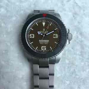 .鬼王 材质:瑞士3836自动机械.肽钢 尺寸:宽40mm 厚11mm 描述:鬼王 劳力士、全钛表壳表带、超强夜光搭配红色秒针完美设计!黑色陶瓷圈口、简洁369字面、超强防水,可潜水游泳,值得入手.